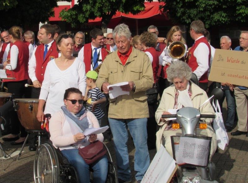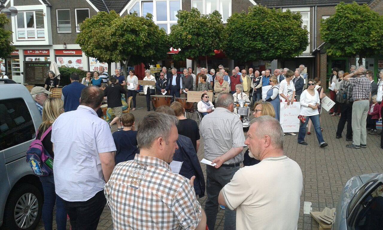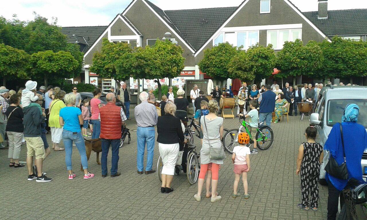 Mit dem Schlag der Kirchturmuhr setzen Trommeln ein. Die Combo spielt packende Rhythmen auf ihren afrikanisch anmutenden Instrumenten. Plötzlich ist es still und das Echo einer Trompete weht über den Marktplatz. „Freude schöner Götterfunken“ spielt die Trompeterin des Jugendblasorchesters Drevenack unter Leitung von Yvonne Unterloh. Die Sängerinnen und Sänger des Chors cantus virus von Hans Alefs stimmen die erste Strophe der Europahymne an. Nach und nach verstärken die Stimmen des Frauenchors Drevenack, des gemischten Chors Bucholtwelmen und des Männergesangsvereins Bruckhausen auf das Zeichen von Dieter Rohde den Gesang. Passanten stimmen mit ein und singen gemeinsam „alle Menschen werden Brüder“. Wer textunsicher war, konnte auf einen der Liedtexte zurückgreifen. Nachdem der letzte Ton verstummt ist, tragen einige Bürger abwechselnd Passagen aus dem Grundgesetz vor. „Die Würde des Menschen ist unantastbar“ oder „Männer und Frauen sind gleichberechtigt“ ist über den Marktplatz hin zu hören. Dazu halten sie Schilder hoch, auf denen die Zitate der Grundrechte zu lesen sind. Zum Abschluss singen alle noch einmal unter Begleitung des Blasorchesters und einzelner Musiker die Europahymne. Unter dem Beifall von Passanten und Beteiligten löst sich der Flashmob locker auf.