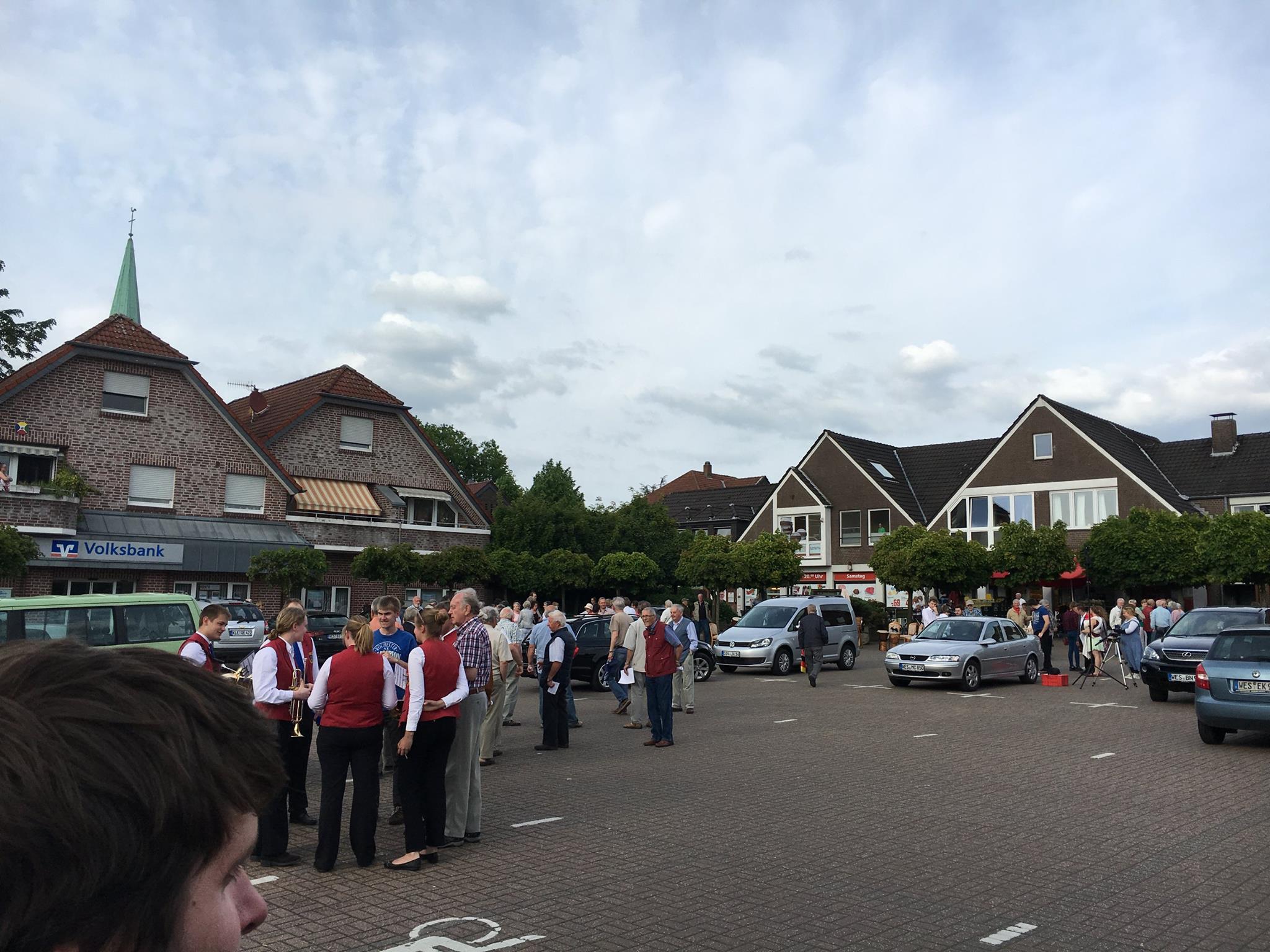 Ungewöhnliches ging am Dienstag-Abend auf dem Hünxer Marktplatz vor sich. Pauken und Trompeten bevölkern kurz vor 18 Uhr den Platz zwischen Sparkasse und Apotheke. Liedtexte werden verteilt, Schilder hochgehalten und Kameras startklar gemacht. Rund 100 Bürger aller Altersklassen versammeln sich wie aus dem Nichts. Just am Tag des Grundgesetzes findet Hünxes erster Flashmob statt.